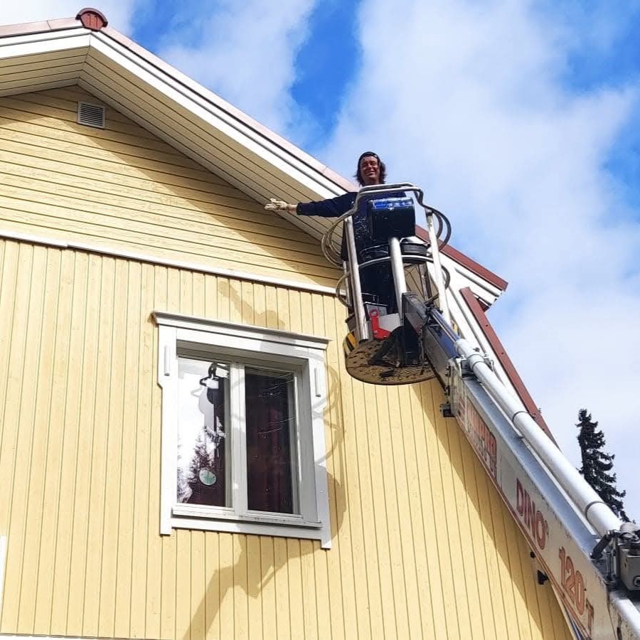 Olen myös kokenut nosturinkäyttäjä ja reipas telineille nousija! Nummelan talo oli sen verran korkea, että sinne tarvittiin nosturi.